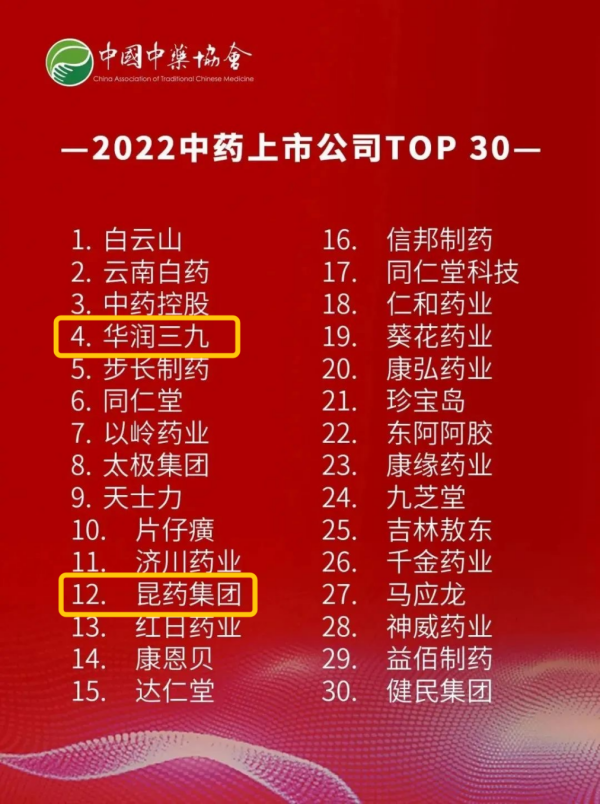了解更多>>>華潤(rùn)三九及旗下昆藥集團(tuán)入選“2022中藥上市公司TOP30”榜單