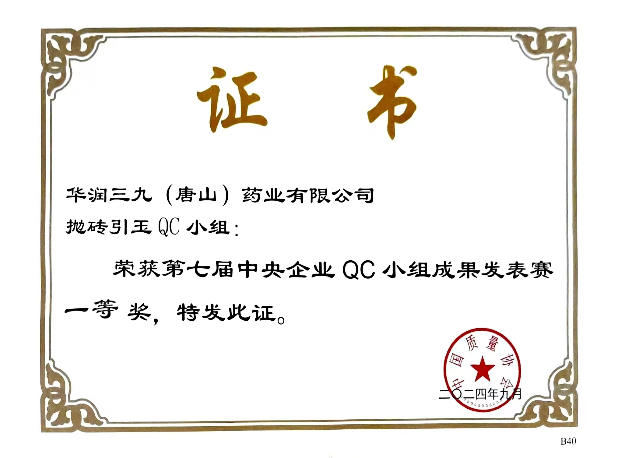 華潤(rùn)三九(唐山)榮獲第七屆中央企業(yè)QC成果賽一等獎(jiǎng)