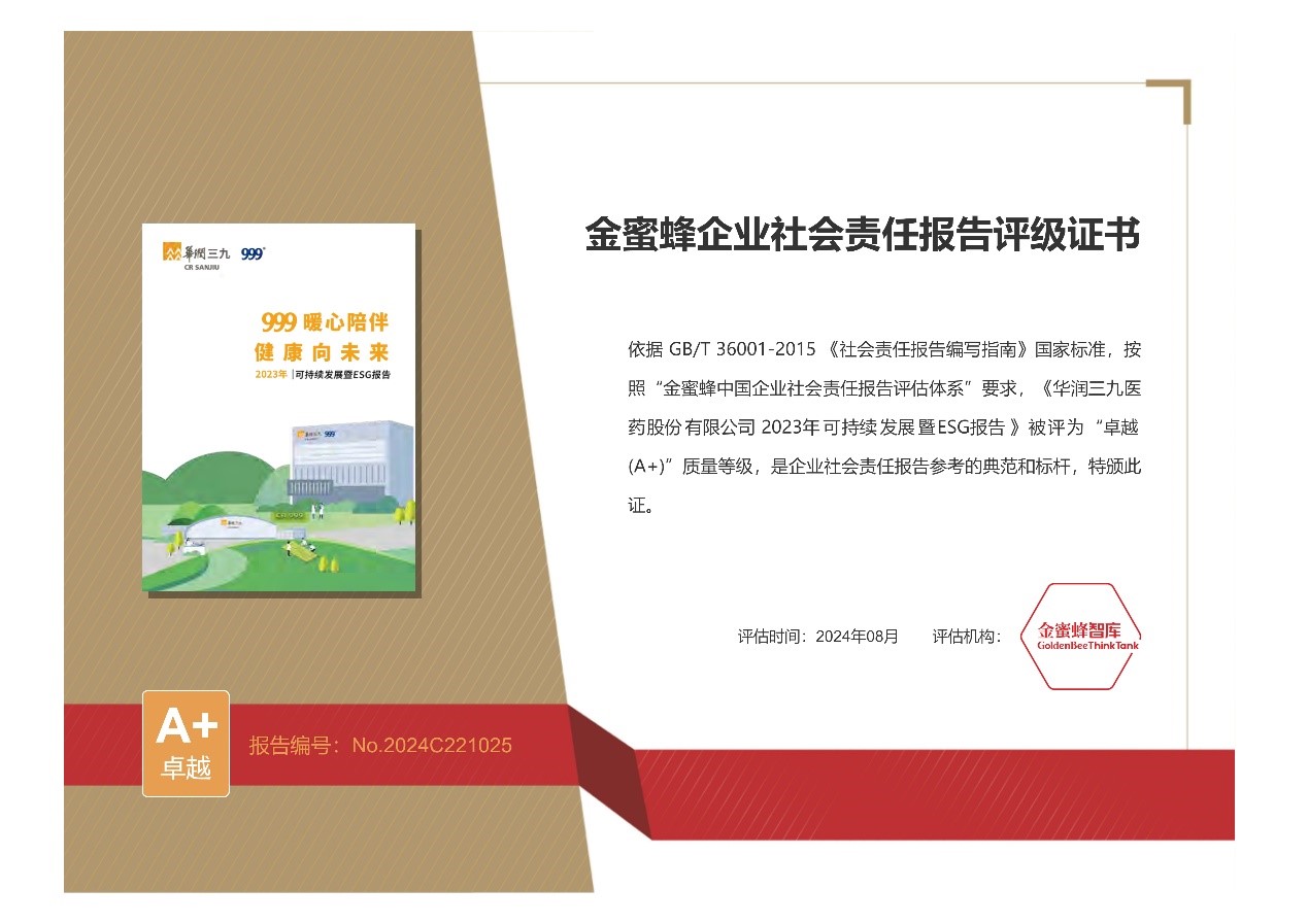 華潤三九獲金蜜蜂企業(yè)社會責任報告“卓越(A+)”評級