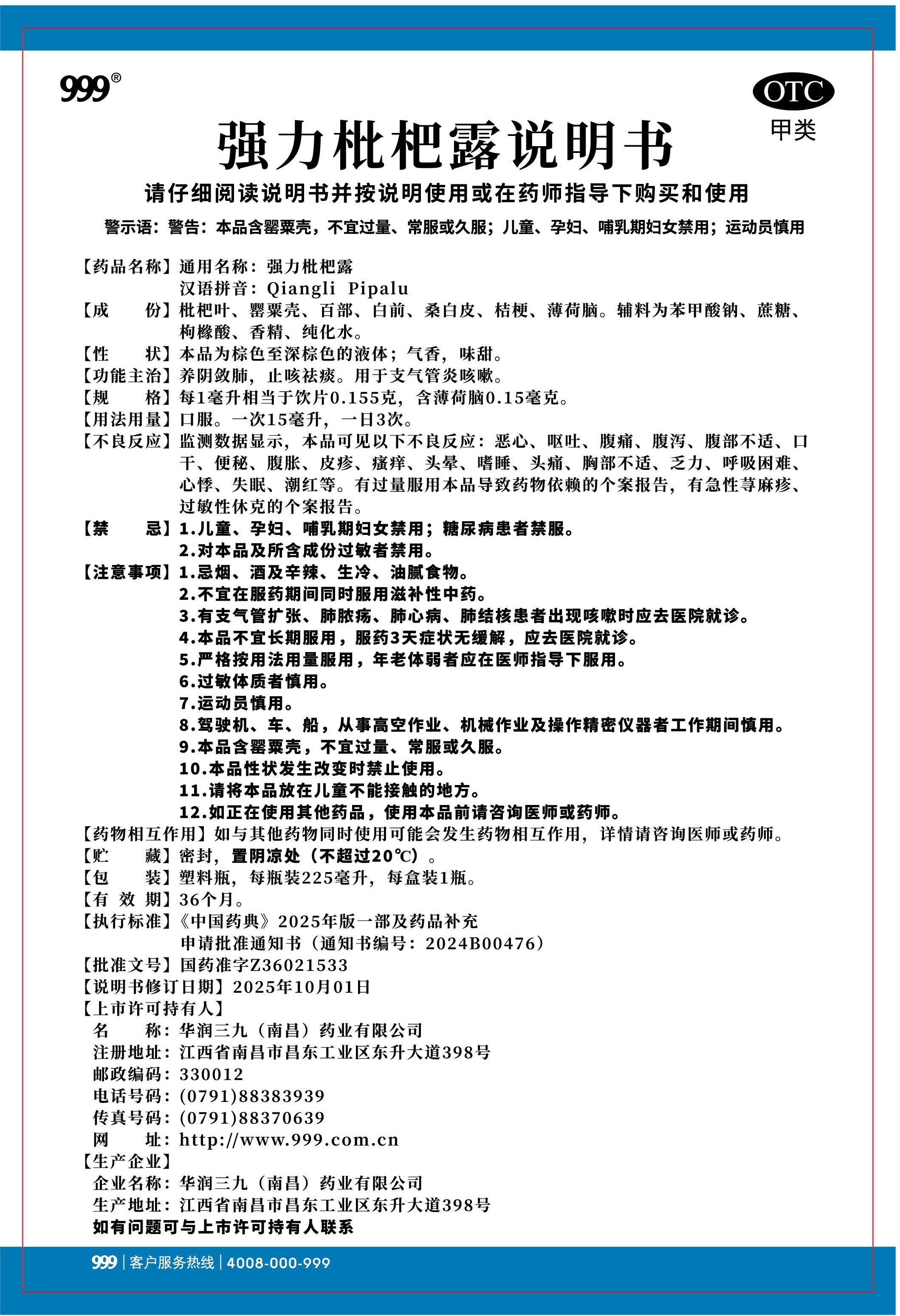 強力枇杷露-南昌三九(225毫升瓶裝)