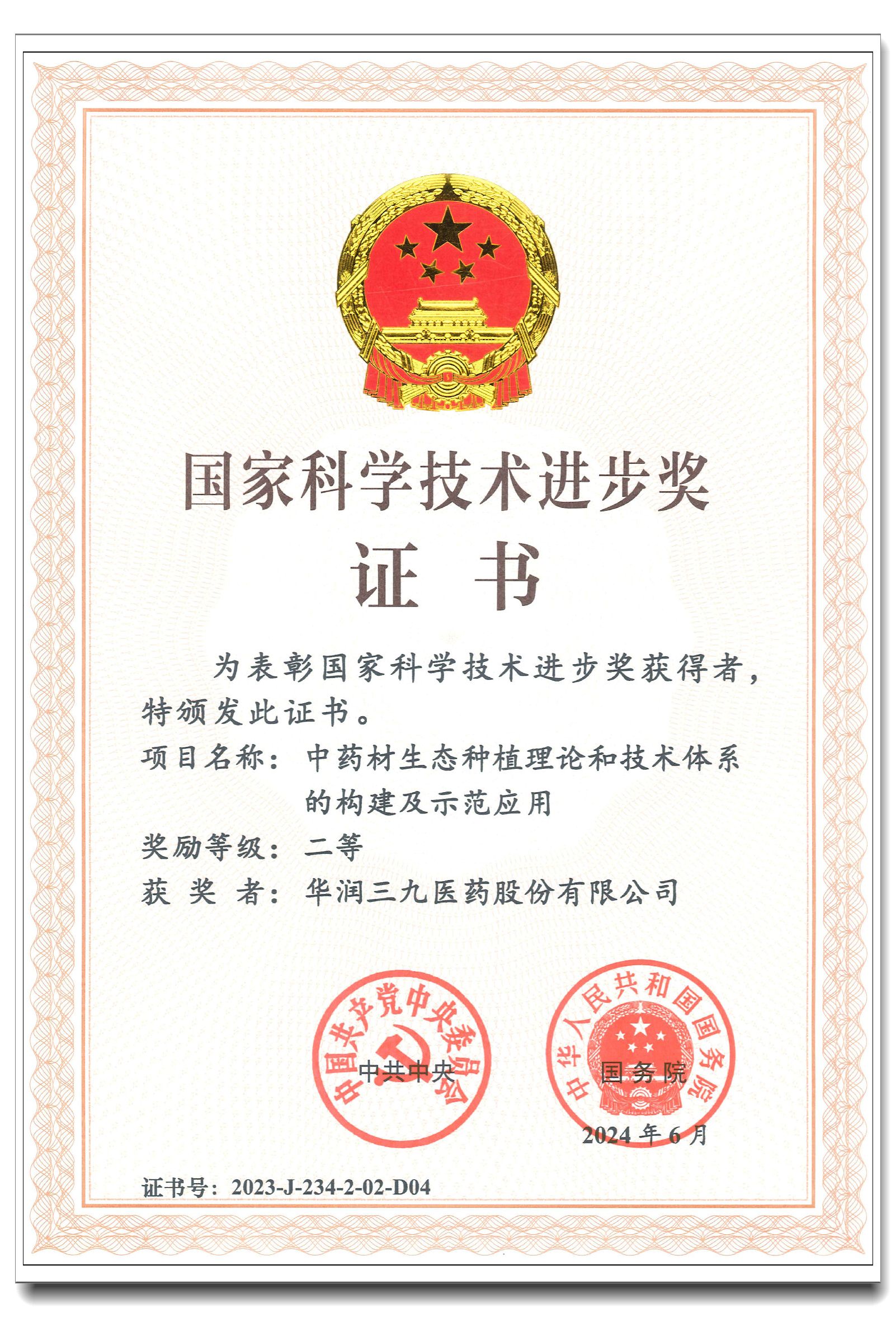 6月24日,2023年度國家科學(xué)技術(shù)獎勵大會在北京舉行。會上,華潤三九參與的《中藥材生態(tài)種植理論和技術(shù)體系的構(gòu)建及示范應(yīng)用》項(xiàng)目再次榮獲國家科學(xué)技術(shù)進(jìn)步獎二等獎,這是對企業(yè)高度重視研發(fā)創(chuàng)新并取得豐碩成果的肯定。此前,以公司產(chǎn)品 “參附注射液”“紅花注射液”“參麥注射液”“新泰林”“999理洫王牌血塞通三七軟膠囊”“青蒿系列”為研究對象的科研項(xiàng)目,先后榮獲國家科學(xué)技術(shù)進(jìn)步獎二等獎。