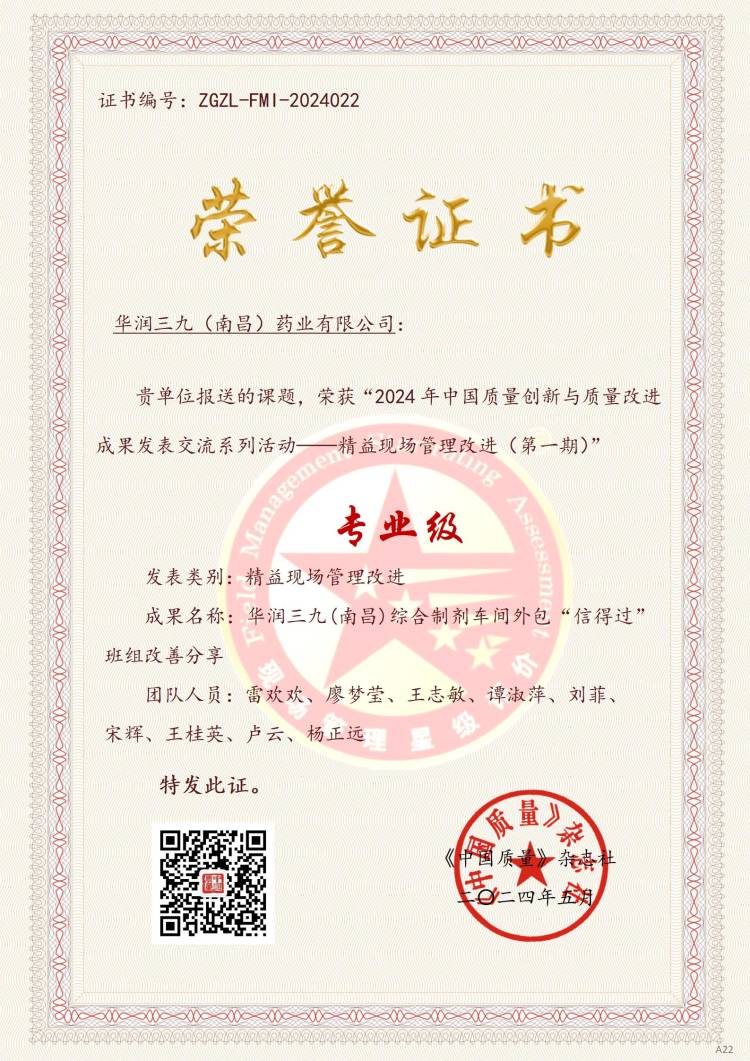 華潤三九(南昌)綜合制劑車間外包“信得過”班組榮獲中國質(zhì)量協(xié)會“專業(yè)級”榮譽(yù)