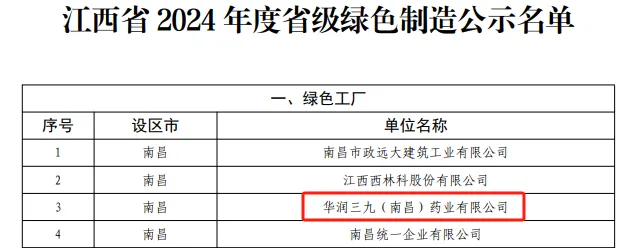 近日,江西省工業(yè)和信息化廳公布了江西省2024年度綠色制造體系名單,華潤(rùn)三九(南昌)藥業(yè)有限公司獲評(píng)“省級(jí)綠色工廠”。