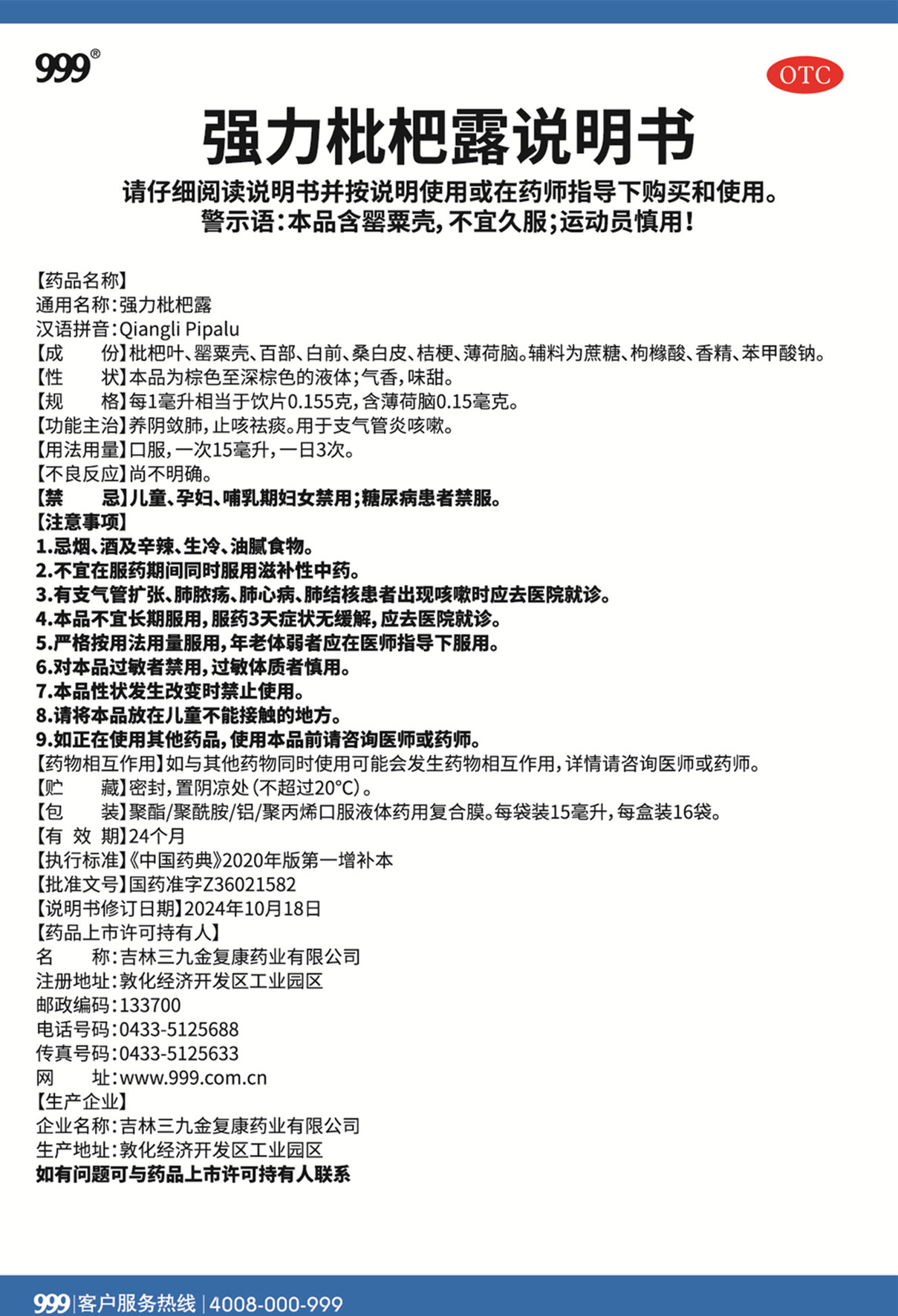 強力枇杷露說明書 請仔細(xì)閱讀說明書并按說明使用或在藥師指導(dǎo)下購買和使用。 警示語:本品含罌粟殼,不宜久服;運動員慎用! 【藥品名稱】 通用名稱:強力枇杷露 漢語拼音:Qiangli Pipalu